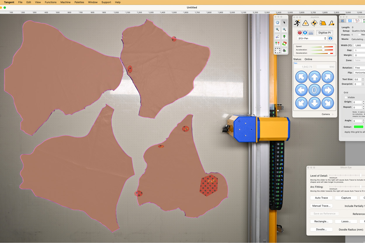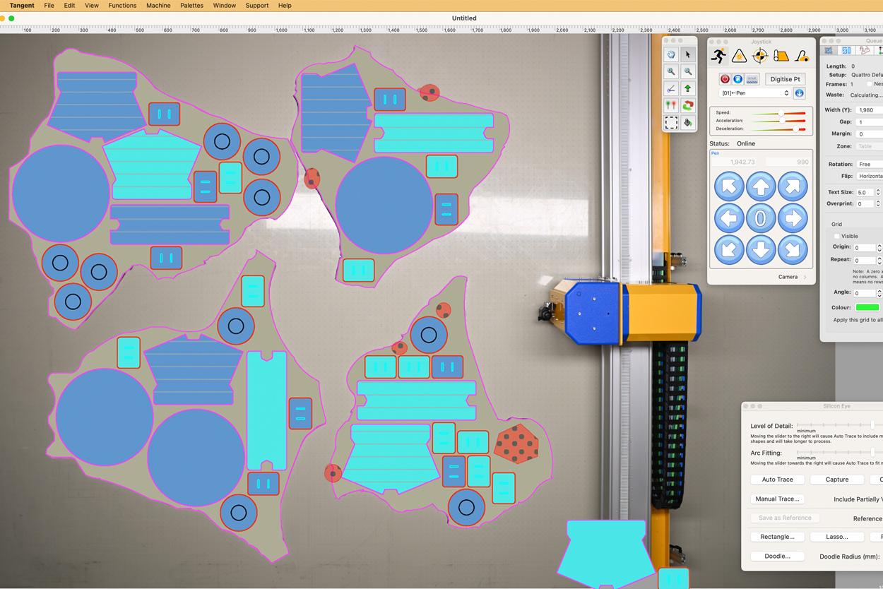 SiliconEye is a whole-table machine vision system using an overhead camera which loads an image directly into Tangent's nesting queue. Anything on the cutting table can now be clearly visualised, digitised or traced. Outlines can be cut or used as background shapes for nesting into. Cut profiles can be confidently aligned with material on the cutting table.