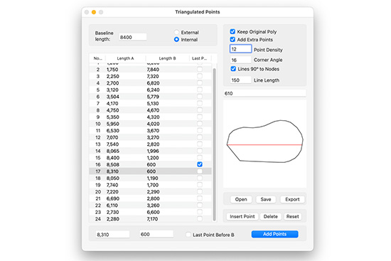 The Triangulated Points tool is a simple stand-alone program which takes the output from normal surveying measurements and generates an outline profile  for editing in CAD software or direct cutting. Typically Triangulated Points is used to pattern products like swimming pool covers and other asymmetrical shapes.