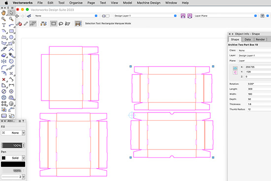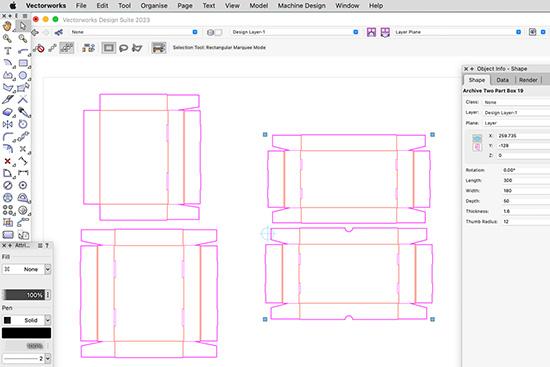 Using a parametric plug-in, the plug-in design is refined to get the best fit from archive board so perfect size individual designs can be created with three or four data entries, ready to cut in seconds.